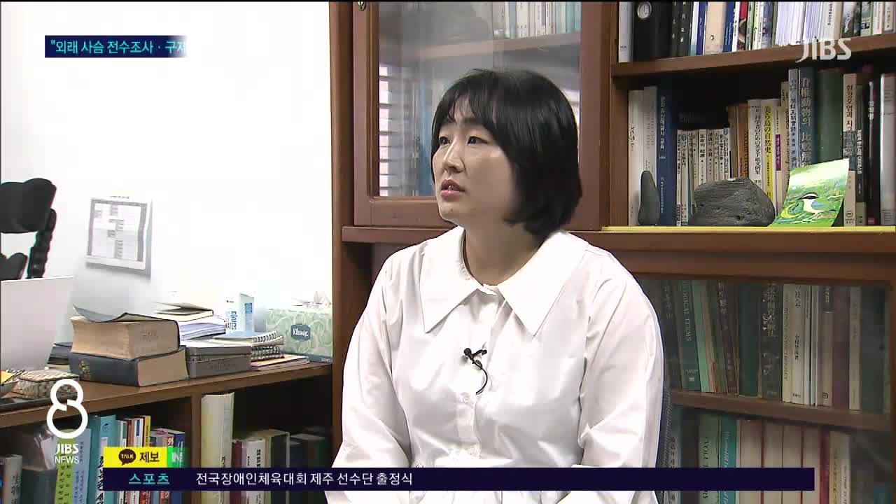 구제 방안을 마련하는 겁니다. 지금은 어디서 외래 사슴을 전반적으로 조사할 수 있는 관리 부서가 물론 제주자치도에서 관리는 하고 있지만, 전담할 수 있는 연구 인력도 모자라고요. 외국 같은 경우는 한 마리 개체를 포획했을 때 그 개체에 대한 전반적인 데이터를 다 관리하고, 어떤 질병이 있는지에서부터 체계적으로 하거든요. 우리는 지금 기초 조사가 제대로 되어있지 않다는 것이거든요. 자료를 갖고 과학적으로 접근해서 미래를 예상해야 되는데... 사람에 의해서 들여온 사슴류에 대해서 우리가 구제를 할 때는 그만한 자료를 우리가 구축해야 이것이 큰 자료가 되어서 나중에 다른 것들이 왔을 때 그것을 기반으로 해서 체계적으로 만들고 관리해나갈 수 있는 데 우리는 그런 자료조차 구축되지 않았다는 점이 굉장히 아쉬울 따름입니다.