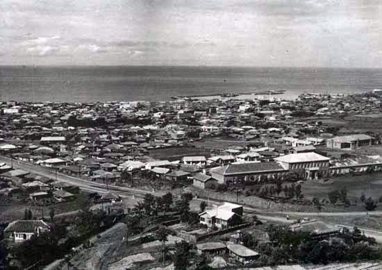 1960년말 광양로터리 부근 중앙로. 도로 가운데 1차선 정도만 아스팔트로 포장이 돼 있다. 제주 칼호텔은 당시 지어지지 않았다. (제주도)