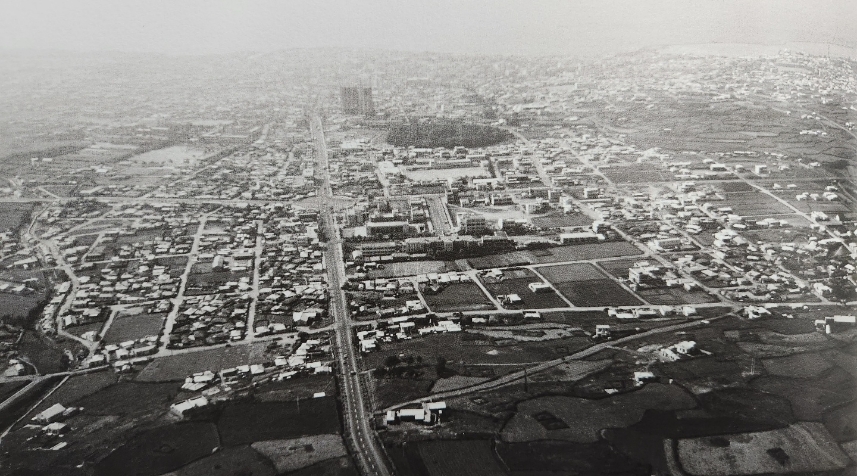 1973년으로 추정되는 시기의 광양로터리 부근 중앙로. 중앙로가 2차선 도로로 포장돼 있다. 멀리 신축중인 제주 칼호텔이 보인다.(제주도)