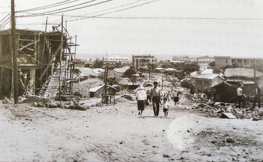 1969년 남문로터리 부근 중앙로 확장 공사. 당시 중앙로 주변에 초가집이 상당히 많았다. (제주도)