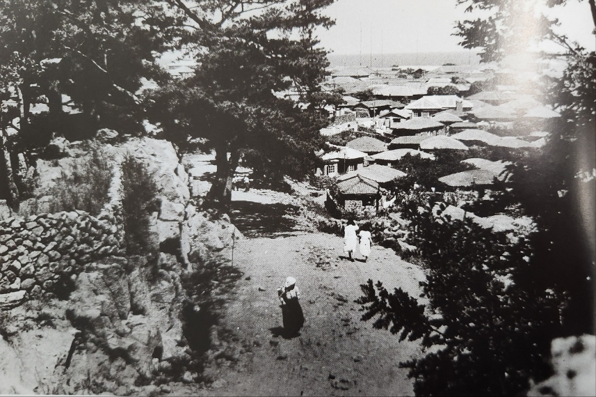 가락쿳물에서 올라오는 도중에 있던 쉼팡. 오현단 울타리 옆 소나무 밑이 쉼팡이었다.(제주 옛 모습, 제주시)