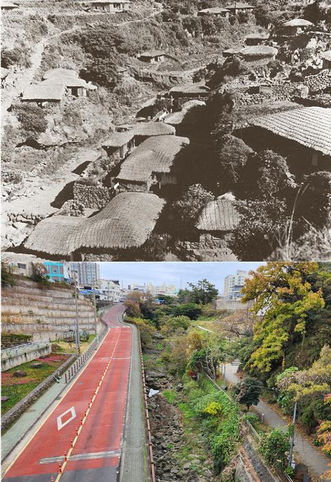 위:1960년대 남수각 모습 아래:가옥이 철거되고 도로가 만들어진 남수각 현재 모습