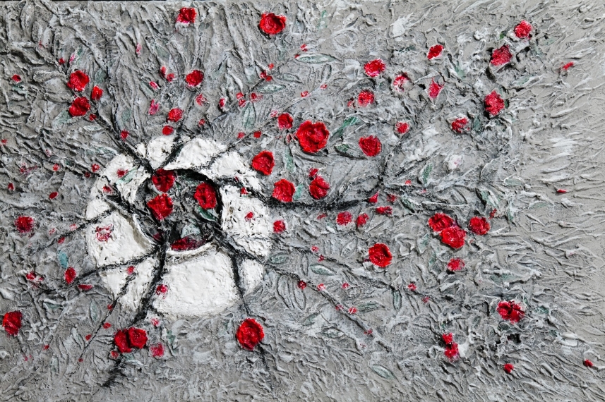 작품에선 조선 백자가 연상되는 달항아리 속에 활짝 만개한 붉은 꽃이 뻗어있는 자태들을 만날 수 있습니다.