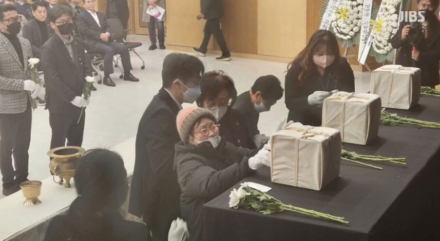 희생자 유족들이 직접 유골함을 품에 안고 신원확인 보고회 현장에 도착하자 유족들은 하나 같이 모두 눈물 흘리며 흐느꼈습니다.