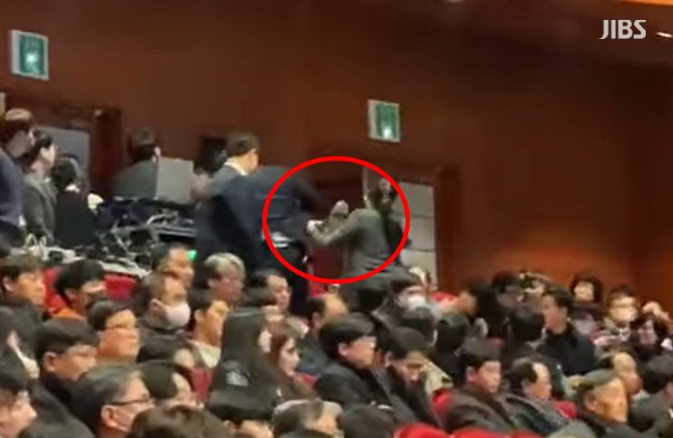 진보당 강성희 의원이 대통령실 경호원들에 의해 행사장에서 쫓겨나는 모습. 빨간 동그라미는 사지가 들린 강 의원의 발 (사진 = 진보당 페이스북)