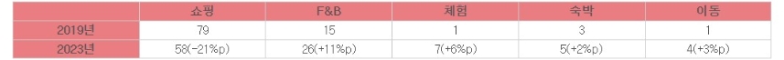 13일 BC카드가 최근 변화하는 외국인 관광객의 소비 트렌드에 대해 분석한 자료에 따르면 단체관광 때 방문이나 소비가 힘들었던 체험(즉석사진, 노래방 등) 매출 비중이 지난해 7%로 코로나 19 이전인 2019년과 비교해 6%포인트(p)나 증가한 것으로 조사됐습니다. (표 1)