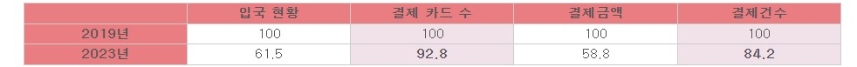 먼저 외국인 관광객 입국자 수나 결제 금액은 2019년 대비 40% 상당 급감한 것으로 집계됐습니다. (표 2)