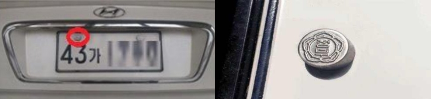 자동차 봉인 예시 : 후면 번호판의 좌측 고정 볼트 위에 설치하며, 정부를 상징하는 무궁화 문양오른쪽)이 각인되어 있다. (국토교통부)