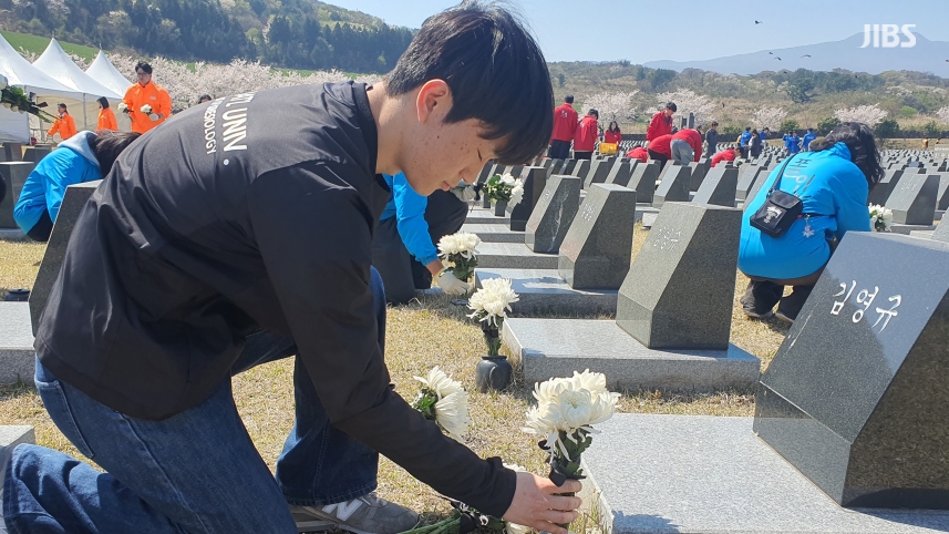어제(29일) 도내 대학생들은 4·3평화공원 행방불명 희생자 표석에 조화를 꽂는 봉사활동을 전개했습니다.