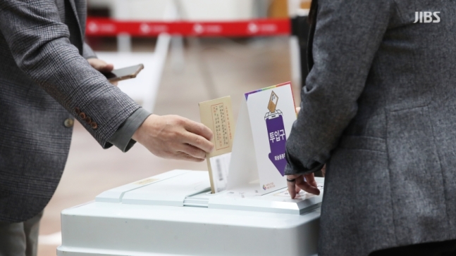 오늘(5일) 제주시청 제1별관에 마련된 이도2동 사전투표소에서 한 유권자가 투표함에 투표용지를 넣는 모습