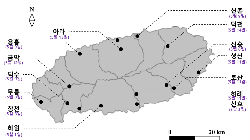 세부적으로 보면 △5월 1일 하원 △5월 3일 신효 △5월 6일 신흥 △5월 8일 창천·무릉 △5월 9일 용흥·덕수·신촌 △5월 11일 하례·토산·성산 △5월 12일 금악 △5월 13일 아라 △5월 14일 덕천 등 순입니다.