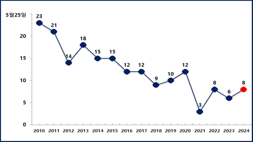 2010년부터 2024년까지 노지 감귤 만개기 변화
