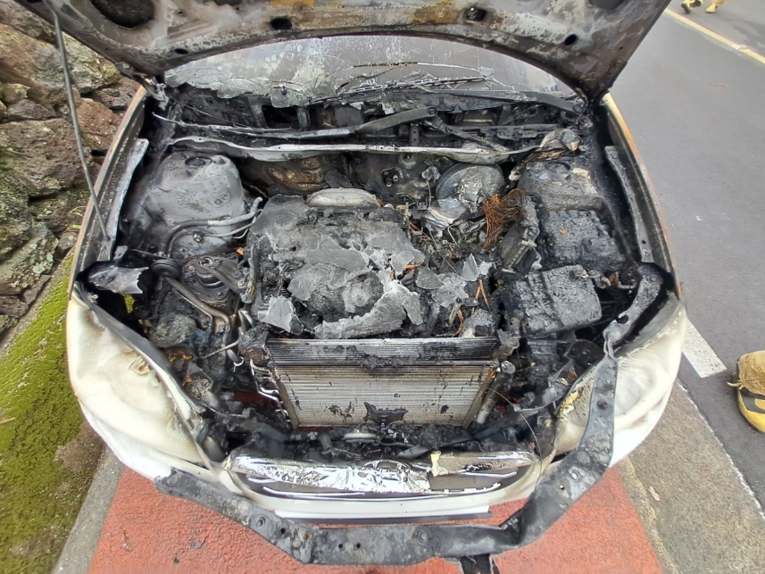 어제(23) 오전 서귀포시 남원읍 한 도로에서 발생한 승용차 화재 피해 모습 (사진, 제주소방안전본부)