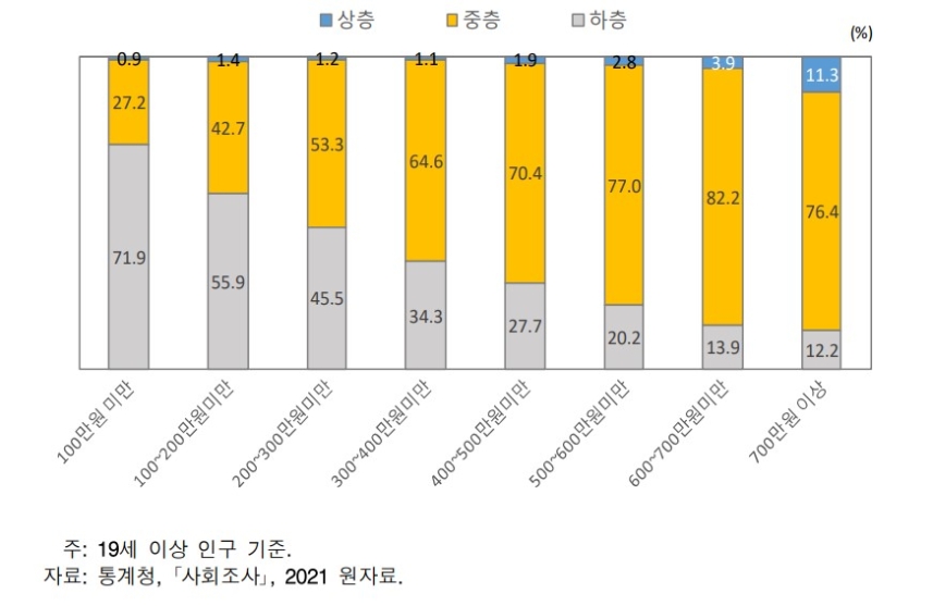 연구진은 주관적 계층의식을 가구소득과 교차해 살펴봤더니 “월 소득이 700만 원이 넘는 고소득 가구 중에서도 자신을 상층이라고 생각하는 비율은 11.3%에 불과했다”면서 “76.4%는 자신을 중산층으로 여겼고, 12.2%는 하층으로 생각하는 것으로 나타났다”고 밝혔습니다.