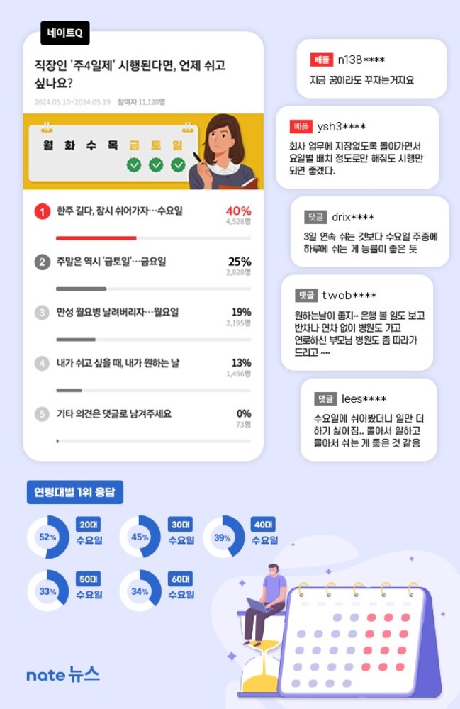 SK커뮤니케이션즈 시사 Poll 서비스인 ‘네이트Q’가 최근 전국 성인 남녀 1만 1,120명을 대상으로 ‘직장 내 주 4일제가 시행된다면 언제 쉬고 싶은가’ 설문조사를 진행한 결과, 응답자 가운데 40%(4,528명)가 ‘긴 한 주 중 쉬어가는 수요일’이라고 답했다고 28일 밝혔습니다.