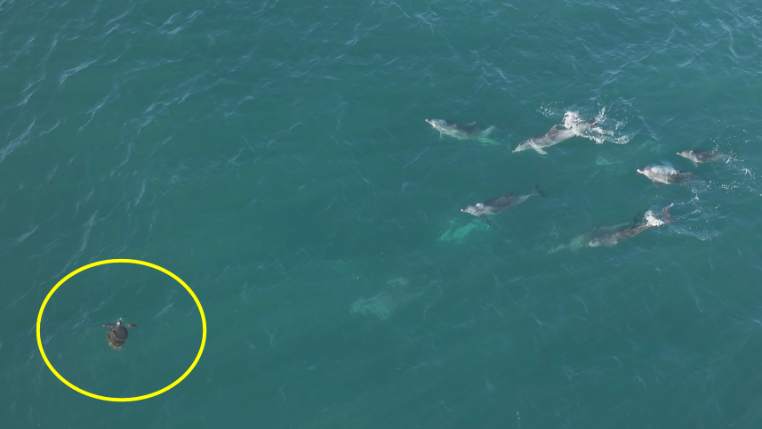 그제(18일) 오후 5시 54분쯤 서귀포시 대정읍 무릉리 해상에서 남방큰돌고래 무리와 바다거북이 동시에 포착된 모습 (사진, 다큐제주, 제주대학교 돌고래 연구팀)
