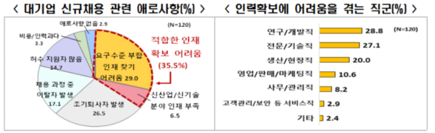 이처럼 심각한 청년 취업난에도 기업들은 정작 원하는 인재를 찾지 못해 일자리 미스매치 현상을 호소했습니다. 기업들은 신규 채용과 관련한 어려움으로 ‘적합한 인재 확보의 어려움’(35.5%)을 가장 많이 꼽았습니다. 세부적으로 ‘요구 수준에 부합하는 인재 찾기 어려움’(29.0%), ‘신산업‧신기술 등 과학기술 분야 인재 부족’(6.5%)이었습니다.