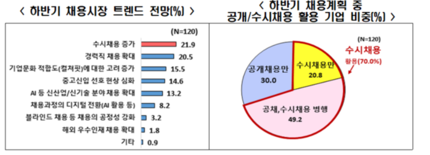 앞서 지난해 같은 시기(2023년 하반기 조사)와 비교해 수시 채용 활용 기업 비중(70.0%)은 작년 하반기(55.9%)보다 14.1%p 늘었습니다.