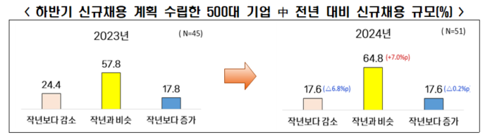 29일 한국경제인협회는, 여론조사 전문기관 리서치앤리서치에 의뢰해 매출액 500대 기업 인사담당자(응답 120개사)를 대상으로 실시한 ‘2024년 하반기 대졸 신규채용 계획 조사’에서 이같이 나타났다고 밝혔습니다.