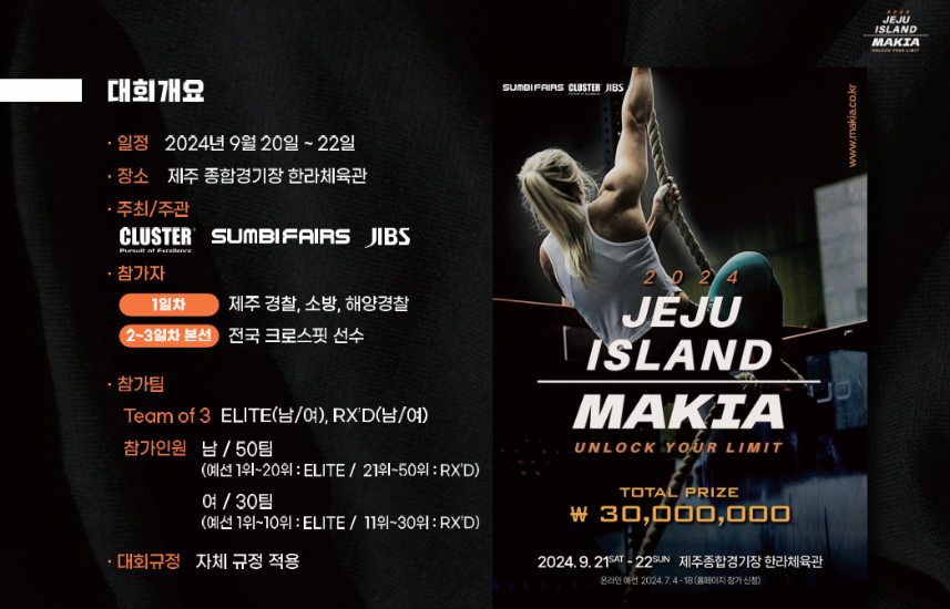 총 상금 3,000만 원이 걸린 크로스핏 공식 라이선스 대회 ‘제주 아일랜드 마키아’가 내일(20일)부터 사흘간 제주종합경기장 한라체육관에서 처음으로 열립니다.