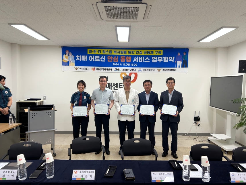 제주동부경찰서 아라파출소는 어제(19일) 제주광역치매센터에서 치매극복의 날을 맞아 ‘치매 어르신 안심동행 서비스 업무협약식’을 체결했습니다.