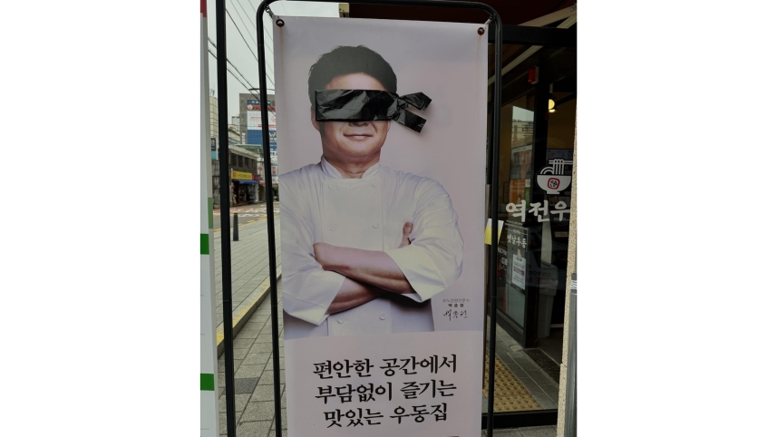 입간판에 검은 안대를 쓴 백종원 더본코리아 대표의 모습이 활용한 더본코리아 프랜차이즈 매장 (사진, ohada_cosmetic 스레드)