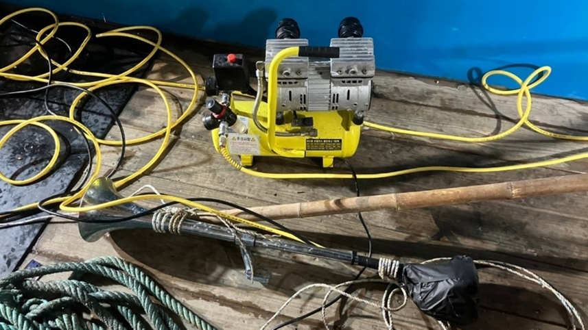 '뻥치기 조업'에 사용되는 나팔 모양 확성기와 공기 압축기