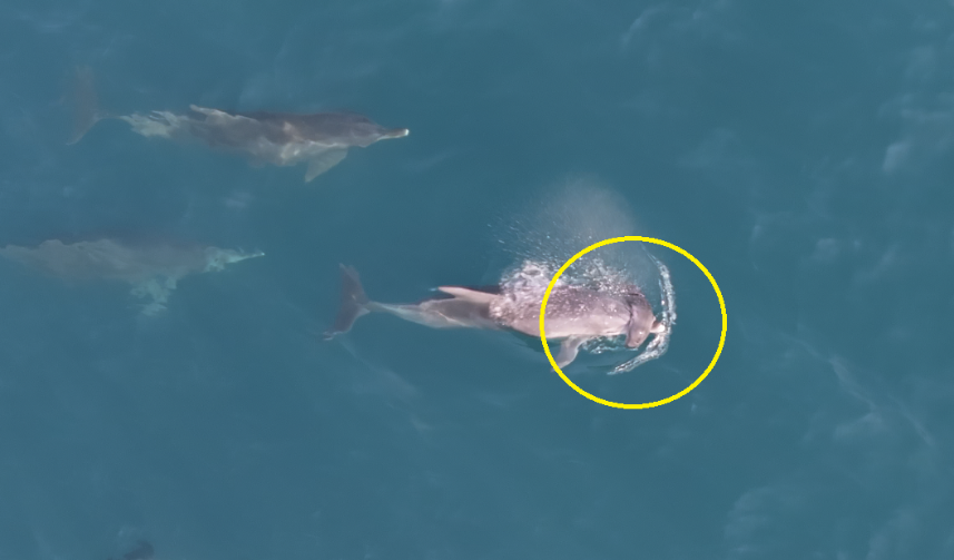 오늘(14일) 오전 제주도 서귀포시 대정읍 무릉리 앞바다에서 포착된 새끼 남방큰돌고래 사체. 어미가 새끼의 사체를 주등이에 올리고 유영하는 모습. (다큐제주 및 제주대학교 고래·해양생물보전연구센터)