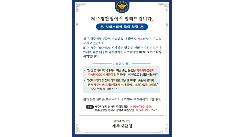 제주경찰청 홈페이지에 게시된 보이스피싱 주의 안내문