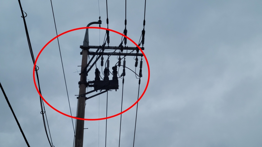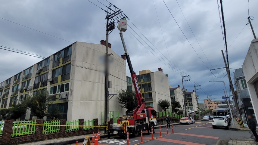 오늘(5일) 오전 제주시 이도2동의 한 아파트 인근의 한 전신주 고압선이 파손된 모습 (사진, 제주소방안전본부)