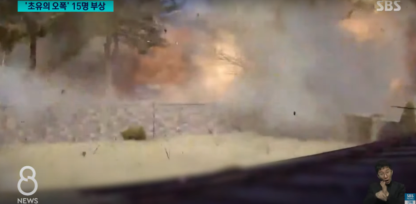 공군이 훈련 도중 마을에 떨어뜨린 폭탄이 폭발하는 모습 (사진, SBS 보도 갈무리)