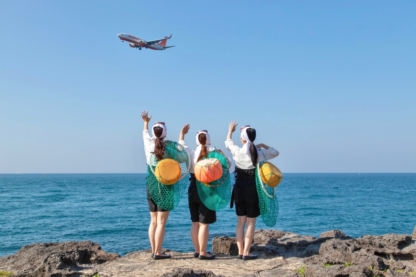 “하늘을 나는 제주, 바다에서 보내는 인사” 해녀복을 입은 세 명의 여성이 바닷가에서 비행기를 향해 손을 흔들고 있다. 시간과 문화, 공간을 가로지르는 따뜻한 인사 한 컷.