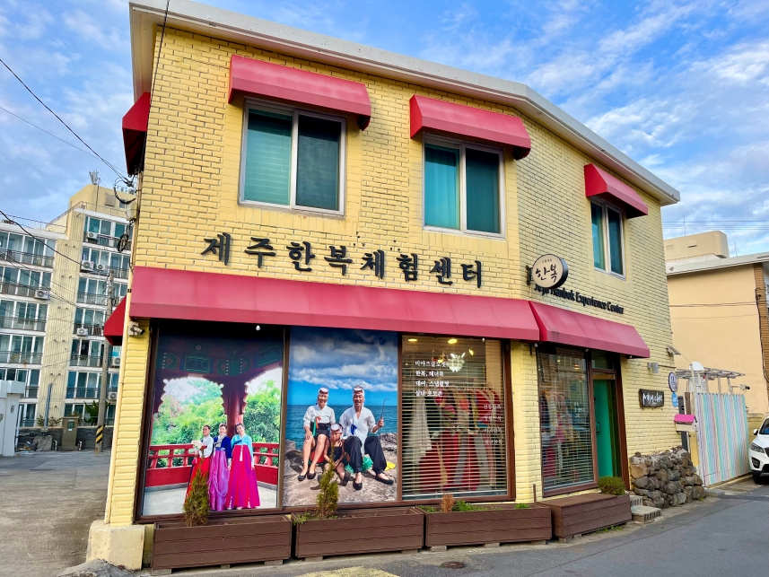 “문화가 머무는 골목, 기억이 시작되는 집” ‘제주한복체험센터’ 전경. 거리의 낡은 벽돌과 창 너머 옷들은, 시간과 공간의 경계를 잇는 문으로 다시 태어난다.