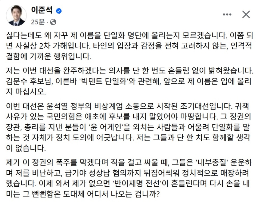 5일 페이스북에 올린 글에서 이 후보는 김문수 국민의힘 후보를 향해 “앞으로 제 이름을 단일화 명단에 올리지 말라”며 “싫다는데도 계속 거론하는 것은 사실상 2차 가해”라고 날을 세웠습니다.