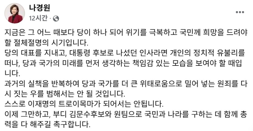 21일 자신의 페이스북을 통해 “지금은 당이 하나 돼야 할 절체절명의 시기”라고 운을 뗀 나 의원은 “스스로 이재명의 트로이목마가 돼선 안 된다”며, 사실상 대선 전 선 긋기를 요구했습니다.