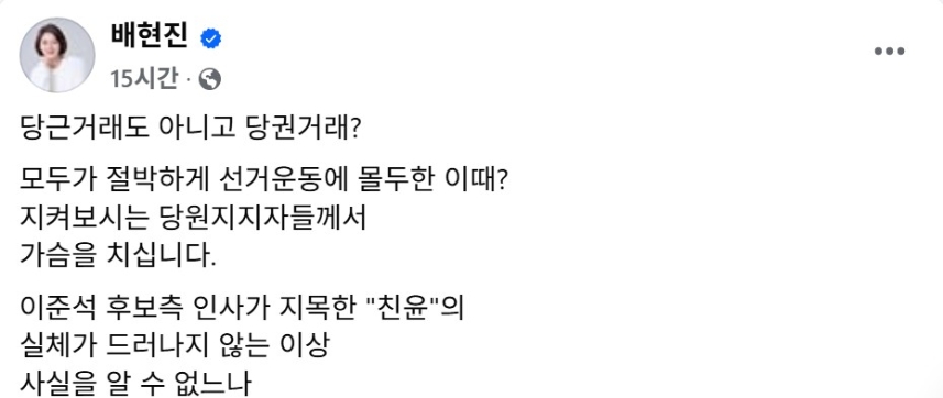 배현진 의원도 21일 페이스북을 통해 “당근 거래도 아니고 당권 거래냐”며 “기생충이나 하는 짓”이라고 직격탄을 날렸습니다.