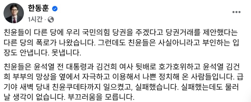 22일, 한동훈 전 대표는 자신의 페이스북에 “친윤들이 다른 당에 우리 당 당권을 주겠다고 제안했다는 폭로가 나왔지만 아무도 반박하지 못하고 있다”며 “윤석열·김건희 부부를 뒷배 삼아 당을 망친 세력들이 끝까지 자리를 지키려 한다”고 강도 높게 비판했습니다.