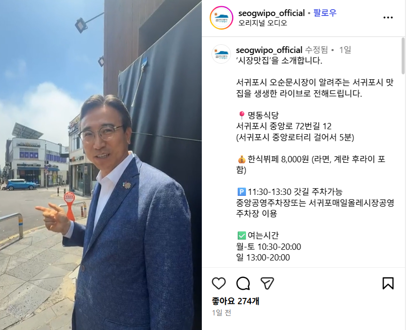 한편, 이 프로젝트는 7월부터 본격 가동될 예정입니다. 서귀포시 인스타그램 계정으로 생중계되며, 관련 게시물에는 메뉴 가격이나 식당 위치, 주차 가능 여부, 운영 시간 등이 상세히 안내됩니다.