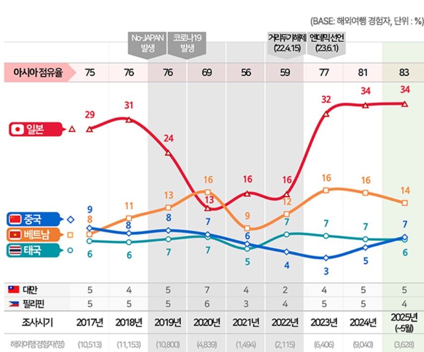 분석에 따르면, 일본은 올해 5월까지 전체 해외여행 중 34%의 점유율을 기록하며 여전히 부동의 1위를 유지하고 있습니다.