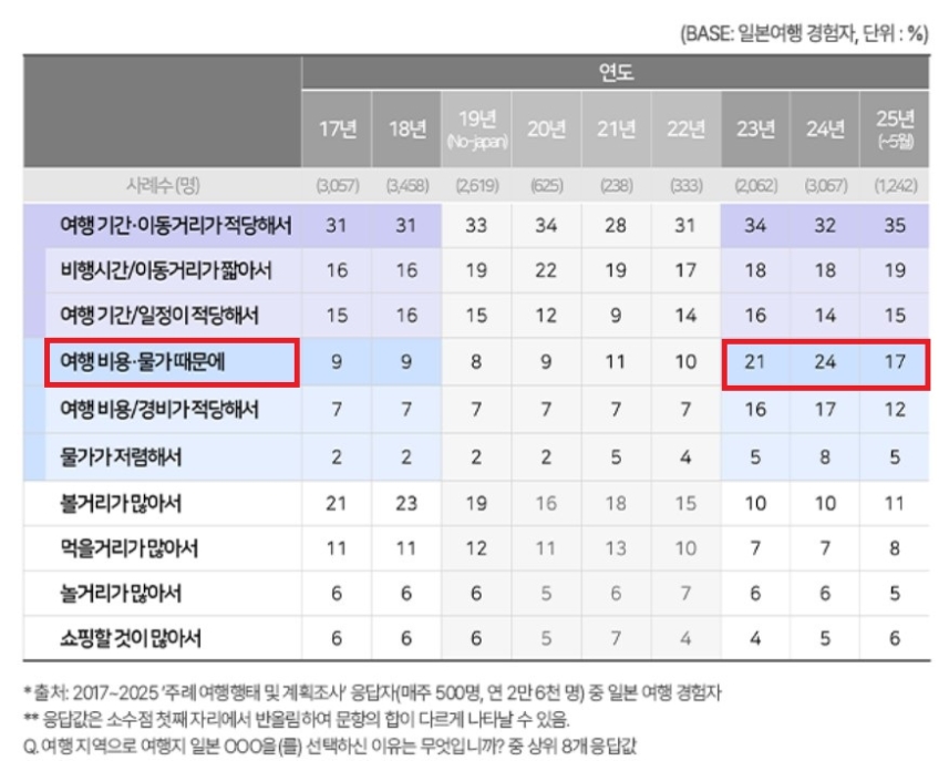 그러나 일본을 선택한 이유 가운데 ‘여행비용·물가’를 꼽은 비율은 2023년 24%에서 2025년 17%로 급락한 것으로 나타났습니다.
