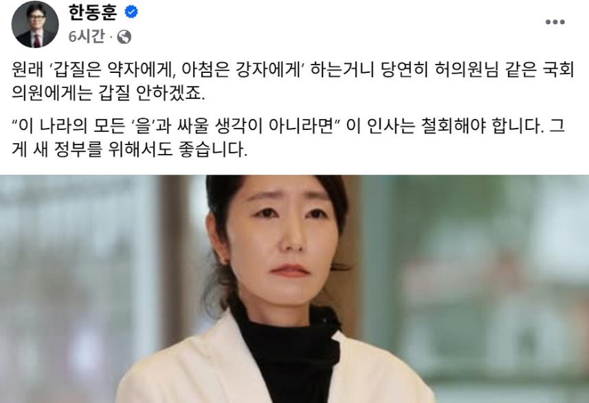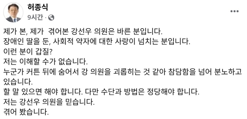 이날 페이스북에 허종식 의원의 옹호 발언 관련 기사를 공유하며, “원래 갑질은 약자에게, 아첨은 강자에게 하는 것”이라며 “허 의원 같은 강자에게는 당연히 갑질 안 한다”고 직격했습니다.