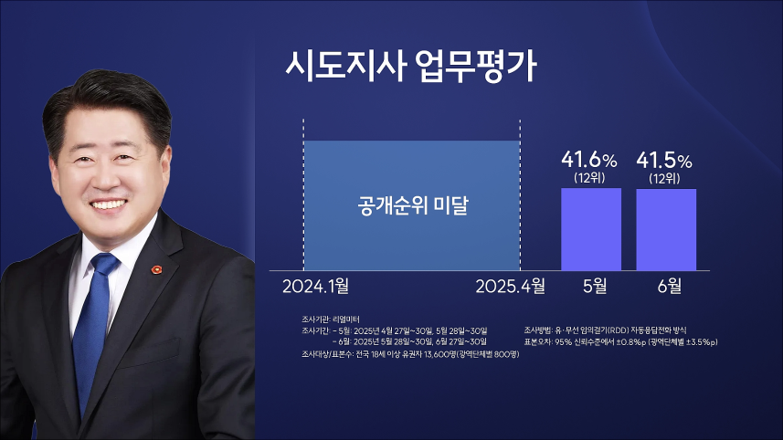 특히 오지사에 대한 부정 평가는 2023년 상반기 24%, 하반기 30%, 지난해 상반기 30%, 하반기 35%, 올해 상반기 39%로 도지사 임기가 지날수록 높아지는 추세입니다.