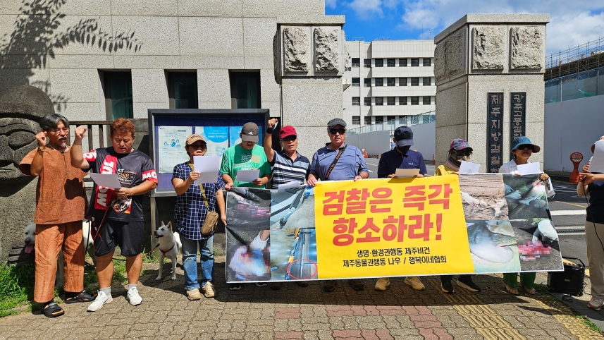 생명·환경권 행동 제주비건과 제주동물권행동 나우, 행복이네협회는 오늘(22일) 제주지방검찰청 앞에서 기자회견을 열고 "훈련된 진돗개를 이용해 야생동물을 학대한 일당에게 법정 최고형을 선고해야 한다"고 밝혔습니다.