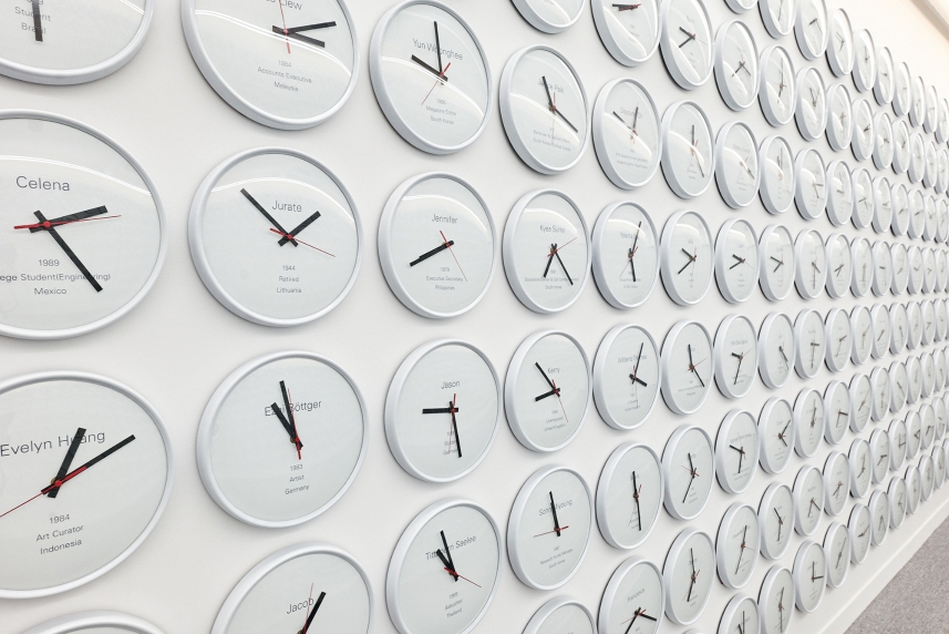 이름과 연도, 직업, 국적이 새겨진 시계판은 하루의 길이가 얼마나 불평등하게 흘러가는지, 시각과 청각을 동시에 자극합니다.