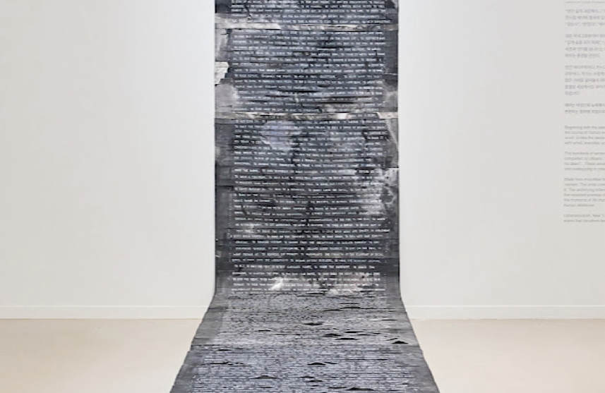 신문지로 가득한 벽에는 수백 겹의 연필선이 얹혀 있습니다. 정보의 표면이 별자리처럼 재배열되며, 기록과 손동작이 다른 차원의 시간을 만들어냅니다.
