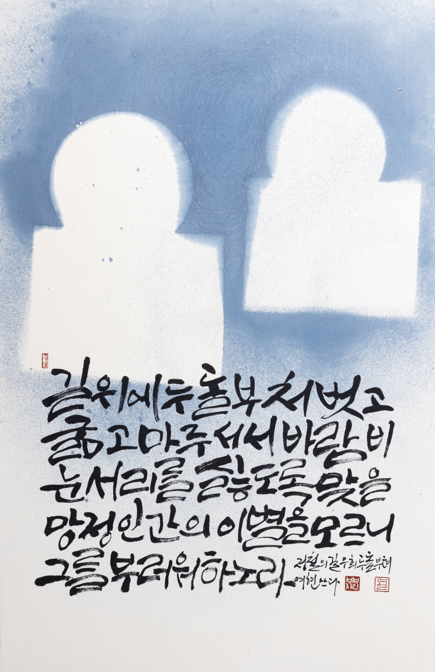 붓끝에서 공동체의 숨결을 끌어내는 건 성정자 작가입니다. ‘길 위의 두 돌부처’에 담긴 선과 획은 한 개인의 필적이면서, 함께 호흡하는 삶의 리듬으로 확장됩니다.