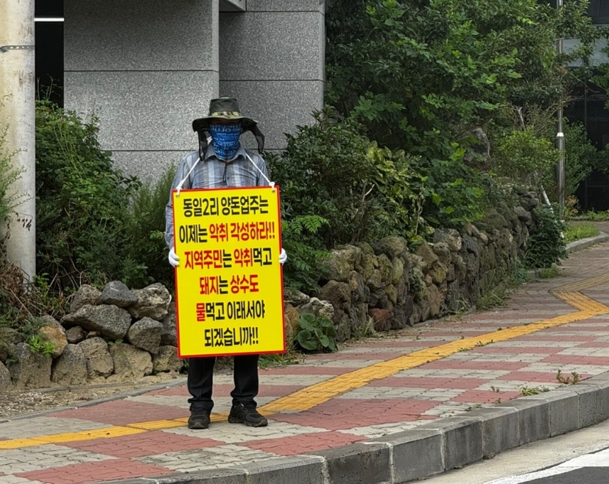 서귀포시 대정읍에 거주하는 60대 주민이 지역 양돈장의 악취 문제 해결을 촉구하며 1인 시위에 나섰습니다.