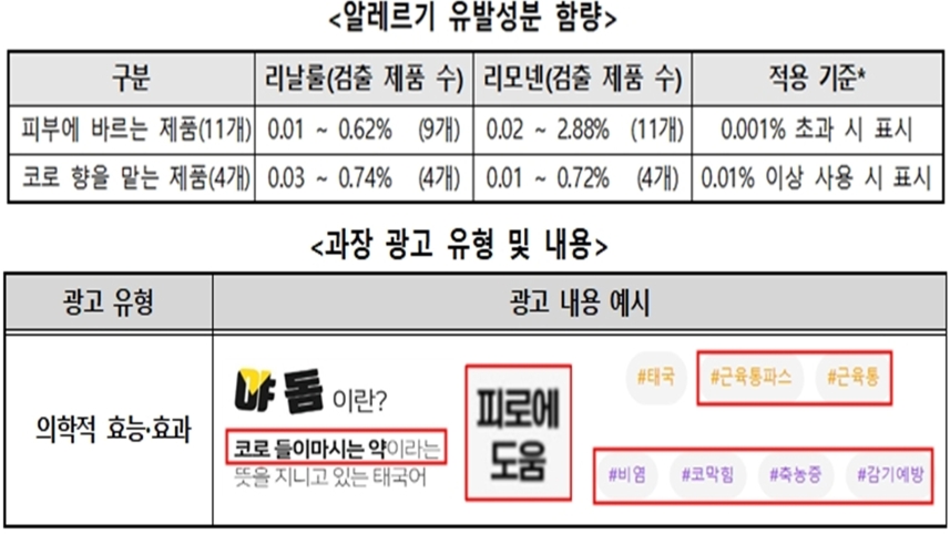 알레르기 유발 성분 함량(위)과 과장 광고 유형