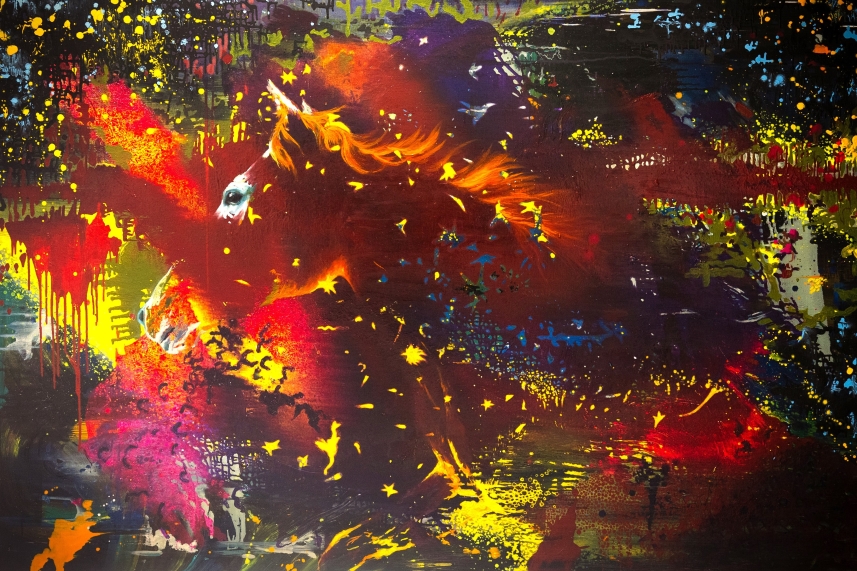 전기숙 작가의 회화. 말의 형상을 휘감은 격렬한 색채가 불꽃과 별빛으로 흩어진다. 화면 전체를 흔드는 원초적 리듬. 이미지가 아닌, 에너지의 폭발이다.