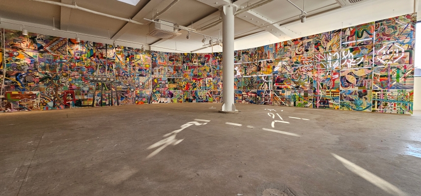 김상균 작가의 ‘의도적 주의력 결핍’ 전경. 수십 개의 캔버스가 하나의 벽을 집요하게 채우며, 재배치와 변주의 과정을 실시간의 사건인양 드러낸다. 벽 자체는 악보였다.